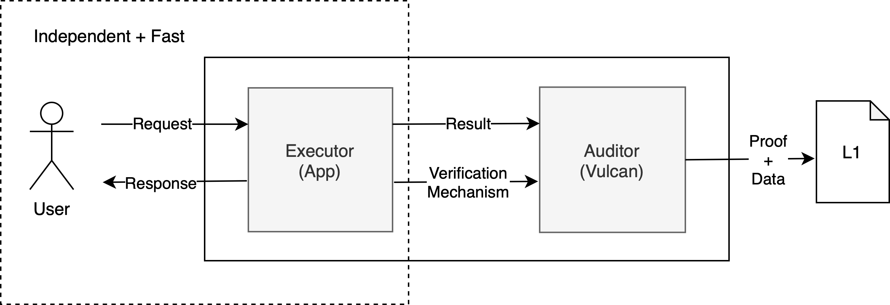 MRUs deliver exceptionally high throughput, mirroring the instant interaction users expect from web2 applications. Upon receiving a user’s request, the application promptly attempts to execute the state changes. If successful, it instantly provides feedback to the user. Subsequently, in according to MRU configurations, the application dispatches the block containing the state update and the corresponding actions to the Vulcan layer. This layer is responsible for verifying the accuracy of the transactions before ultimately recording the data on the blockchain.